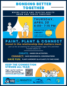 Join us for Bonding Better Together: Paint, Plant & Connect at the Wasatch County Library—a fun evening for youth and adults to create, connect, and grow together. Enjoy hands-on activities, meaningful conversation, a light dinner, and take home a plant to remember the experience!